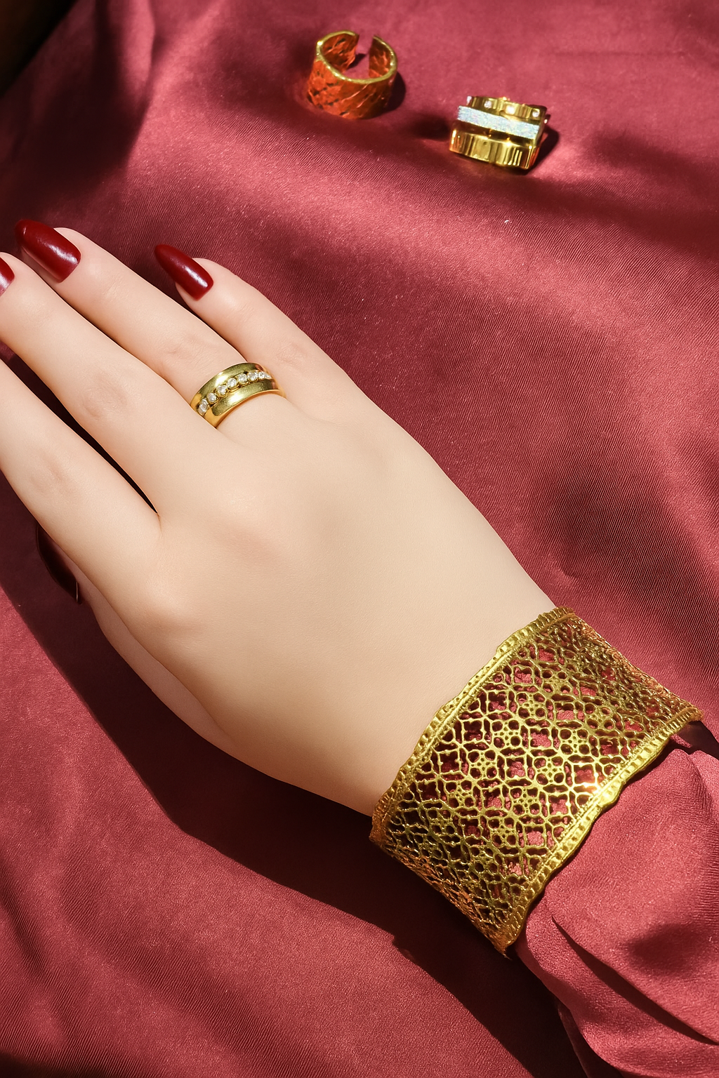 "عيشي سحر الفخامة مع سوار ايلانورا المذهب بعيار 18 قيراط — تحفة تجمع بين الأناقة والمتانة. مصنوع من الفولاذ المقاوم للصدأ عالي الجودة ومطلي بتقنية الطلاء الكهربائي المتطورة، يتميز بـ:
